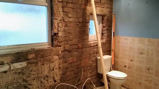 Bath removed in corner, 1st fix plumbing for wall hung radiator and bath with centrally positioned bath/shower mixer tap.