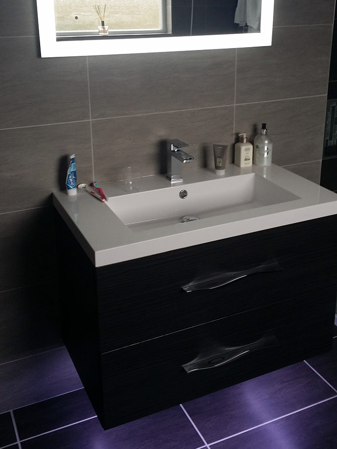 Integral storage cupboards and shelving, wall hung basin with illuminated motion sensor mirror and LED-underlit basin unit.